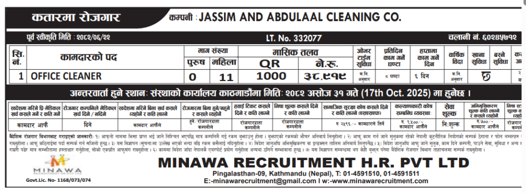 | 1 | Office Cleaner | 0 | 11 | – | 1000.00 | ~NPR 37,000 | 8 Hours | 6 Days | 2.00 | Provided | Provided | 0 | 0 | 0 |